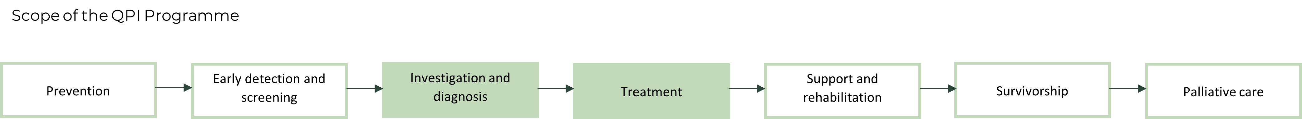 This programme intends to provide information on the full cancer pathway from referral through to diagnostics to treatment (see figure below) to survivorship and palliation. However, due to current data limitations in national collections, most QPIs are focused on treatment. This will change as new data becomes available - the programme also aims to highlight where data collection or reporting improvements could be made.