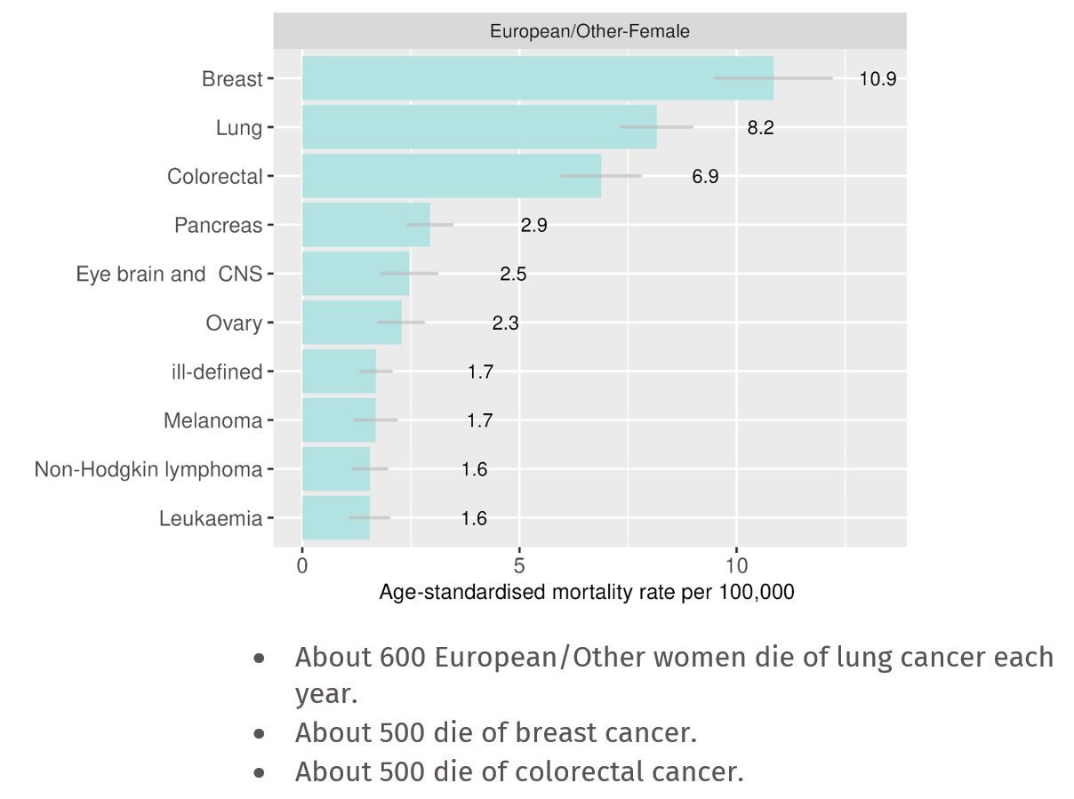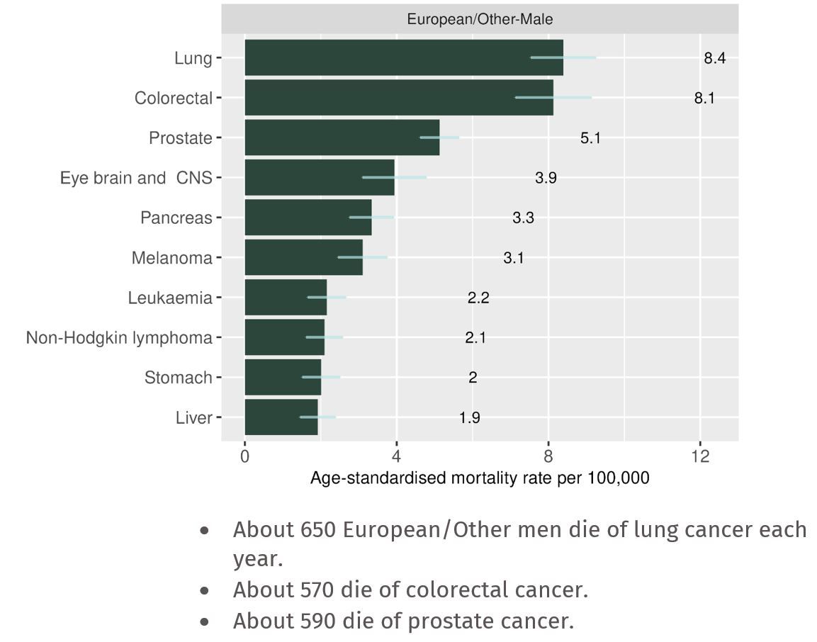 European/Other What are the most common causes of cancer death for European/other people in Aotearoa? The first graph below shows the most common causes of cancer death for European/Other females. The second graph shows the most common causes of cancer death for European/Other males.What are the most common causes of cancer death for European/other people in Aotearoa?