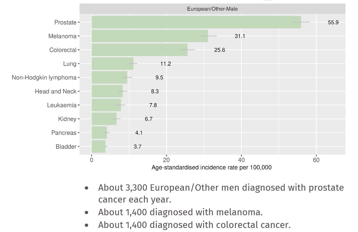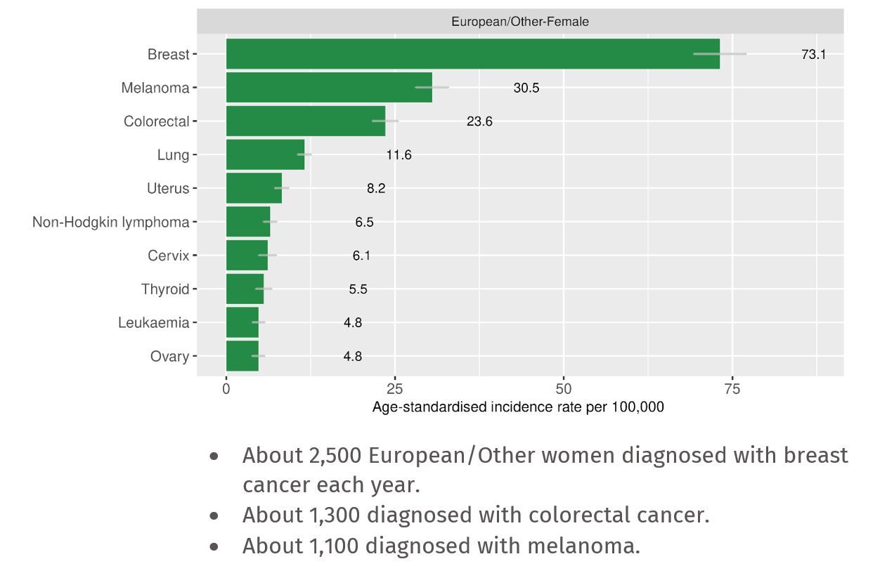 European/Other Common Cancers What are the most common cancers for European/other people in Aotearoa? The first graph below shows the most common cancers for European/Other females. The second graph shows the most common cancers for European/Other males.What are the most common cancers for European/other people in Aotearoa?