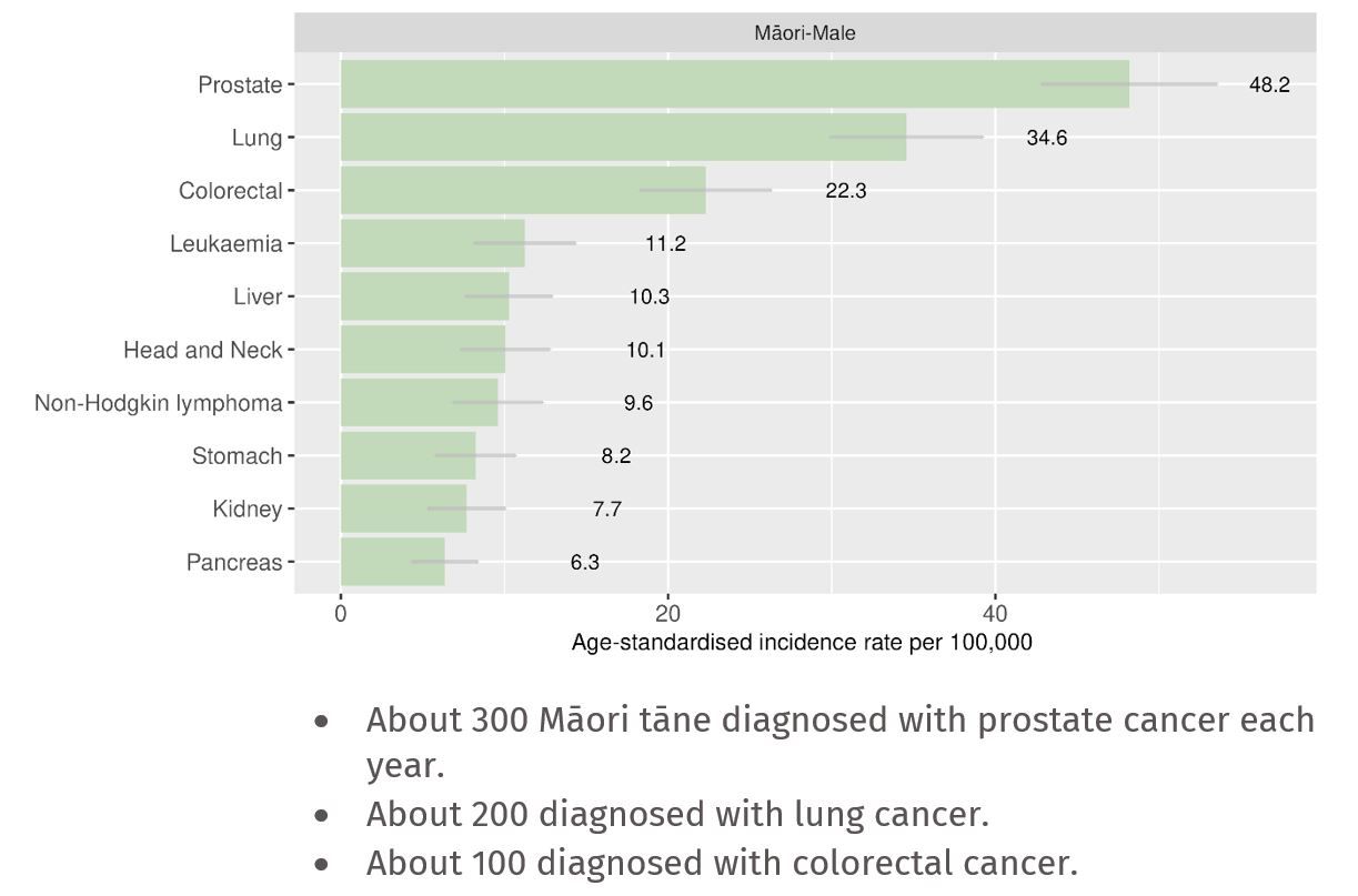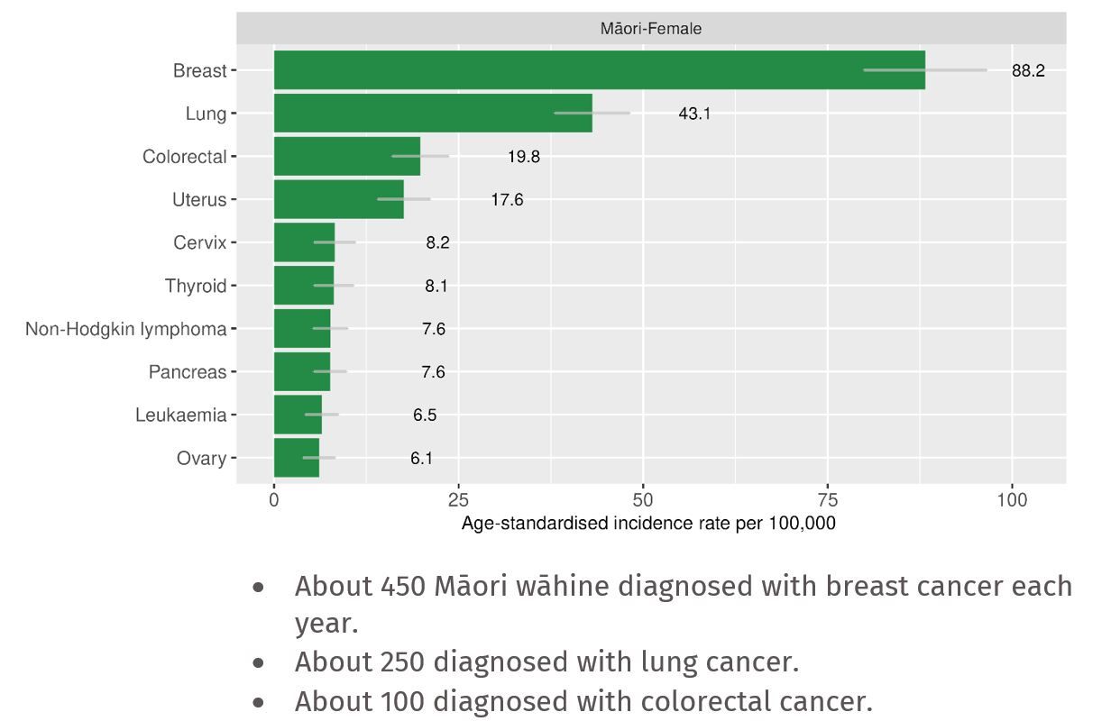 Māori are more likely than non-Māori to be diagnosed with a range of cancers, including breast, liver, lung, pancreatic, stomach and uterine. However, non-Māori (primarily New Zealand Europeans) are more likely than Māori to be diagnosed with melanoma and prostate cancers.What are the most common cancers for Māori