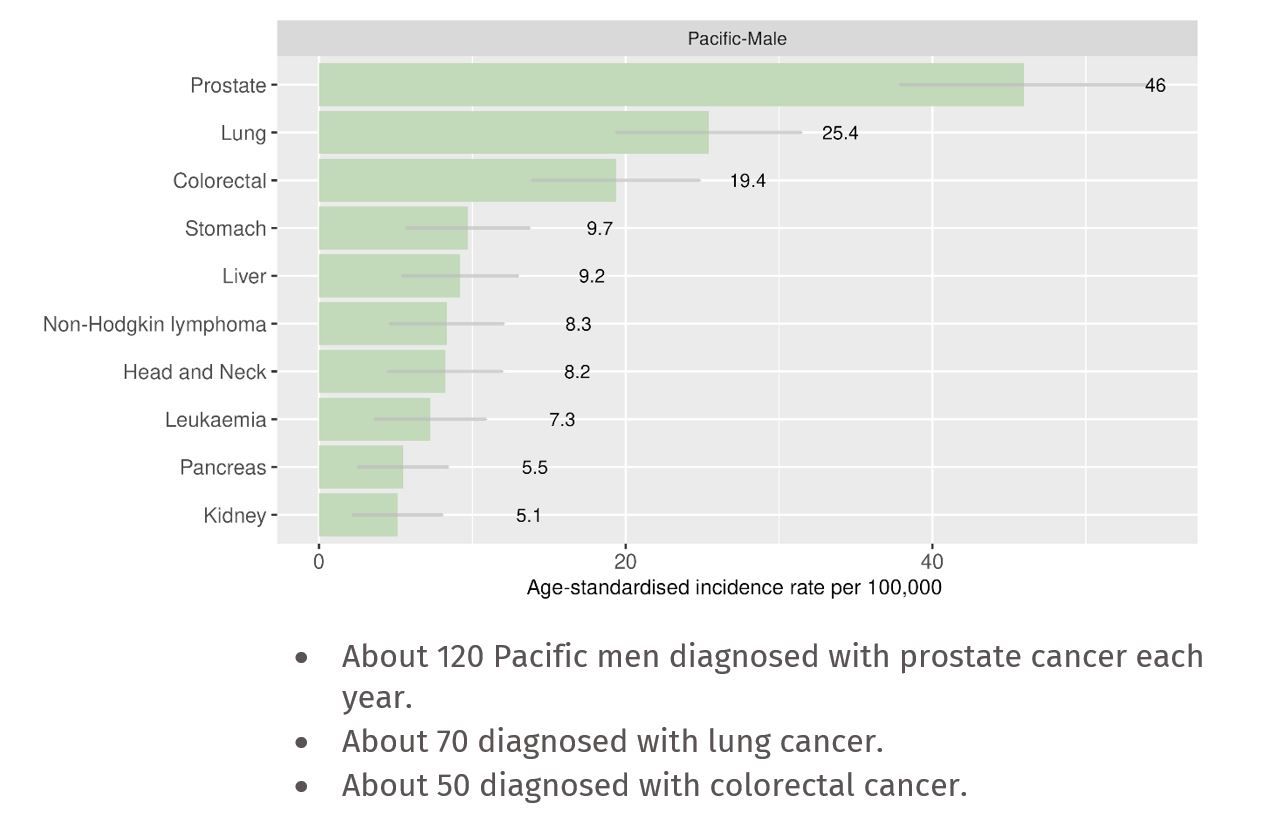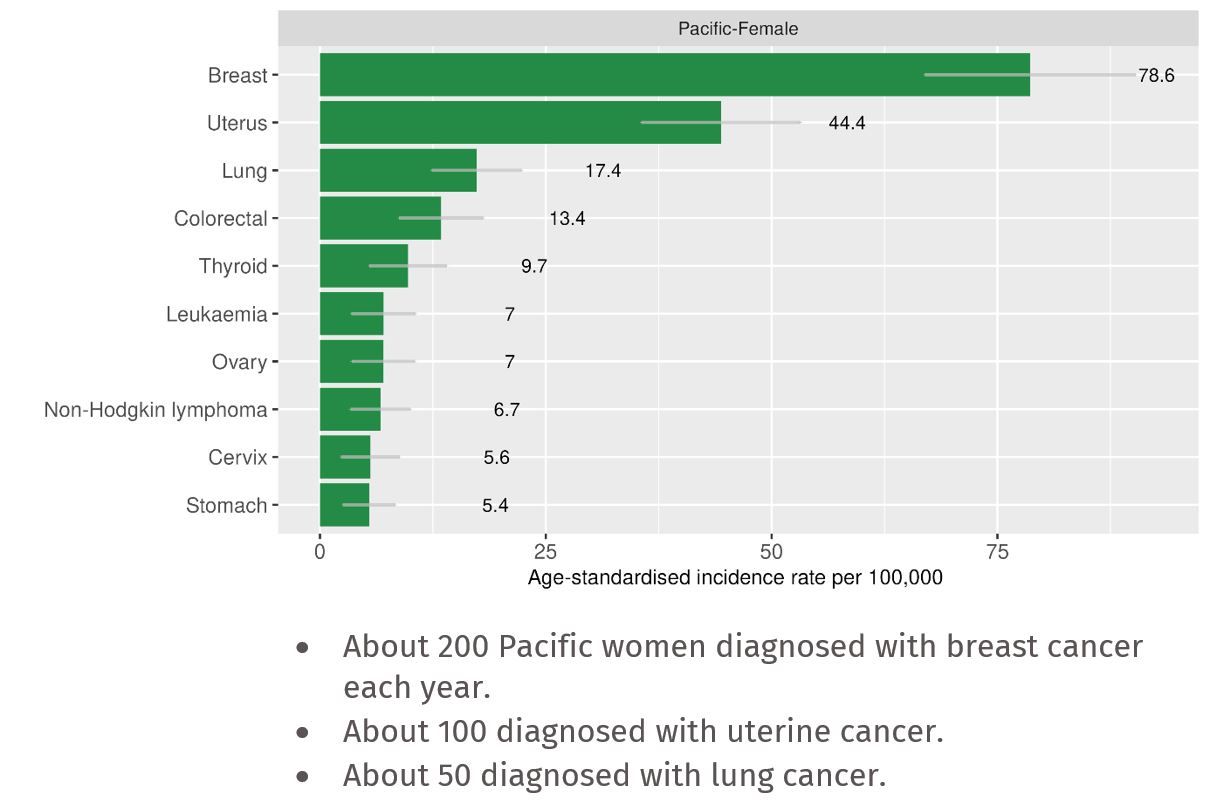 Pacific Common Cancers What are the most common cancers for Pacific Peoples? The first graph below shows the most common cancers for Pacific females. The second graph shows the most common cancers for Pacific males.What are the most common cancers for Pacific Peoples?